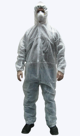 Одноразовый комбинезон на "молнии", с капюшоном, изготовлен из нетканого материала , представляющего собой комбинацию полипропиленовых и полиэтиленовых волокон , что позволяет обеспечивать необходимый уровень защиты при внешней легкости и прочности.